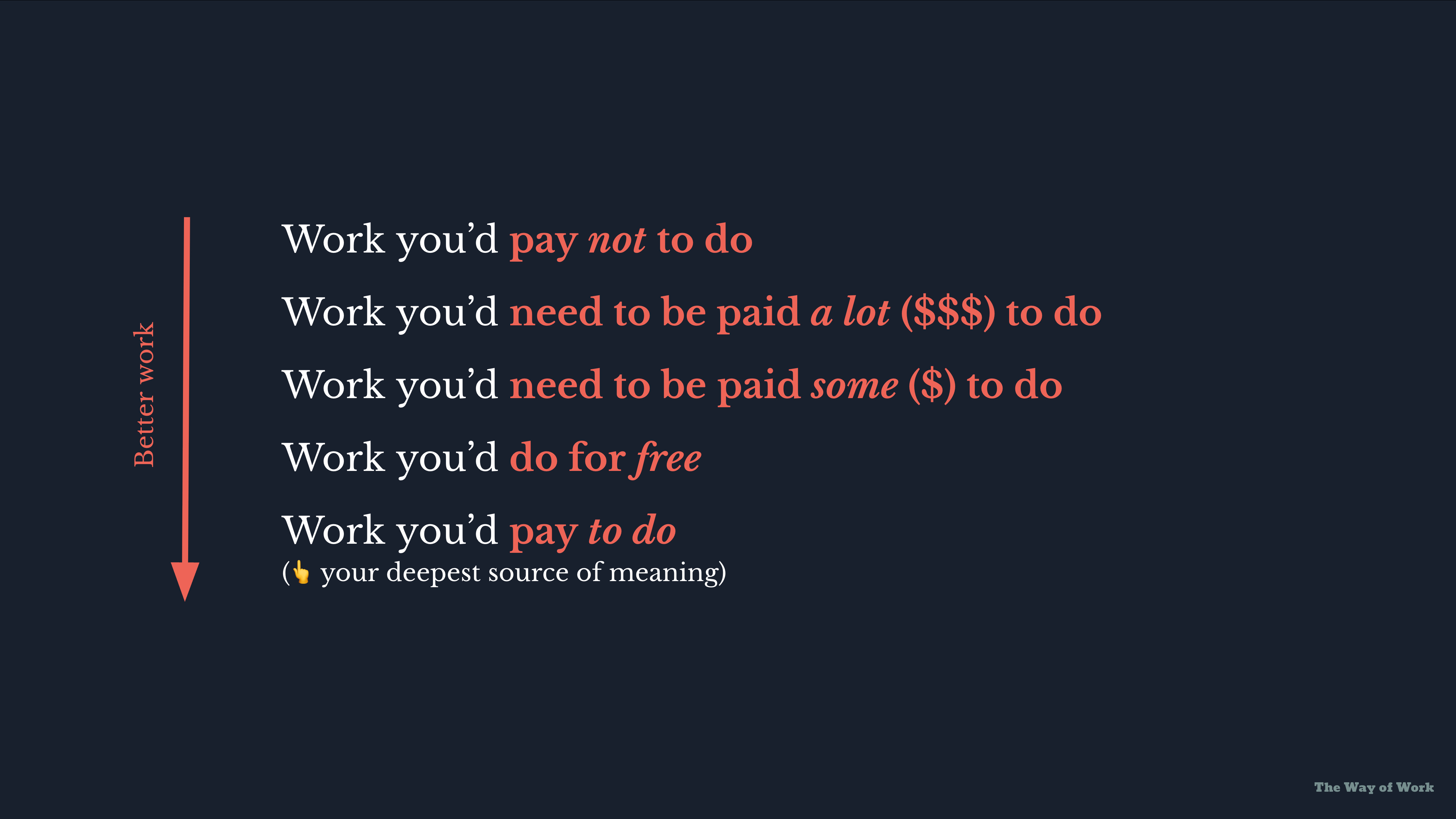 Maybe you need the money, even if it’s not the “best work.” That’s most people. But if you can name the thing you’d pay to do, you can start moving toward it, even slowly. Or maybe you have no idea yet — in that case, keep searching.