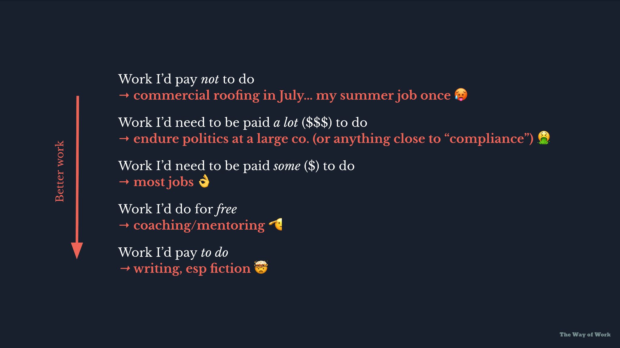 Two years ago, I didn’t know the last 2 levels on this continuum even existed. My concept of “work” was highly restrictive. Now I like writing so much that I’d do it even if it never makes me a dollar (I even expect to lose money from it). This is not meant to induce jealousy or “look at me, my life is so great!” It’s just evidence — from one former workaholic — that there are other forms of work worth taking seriously.